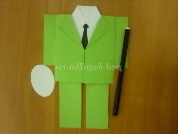 14. 15. Далі приступаємо до роботи з деталями штанів - їх підклеюємо на внутрішню частину піджака, потім ця частина сховається під сорочкою. Для того, щоб передати « стрілочки» на брюках потрібно деталь загнути навпіл.