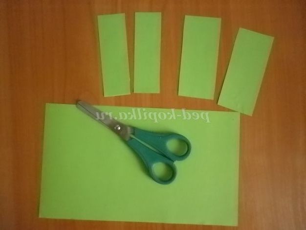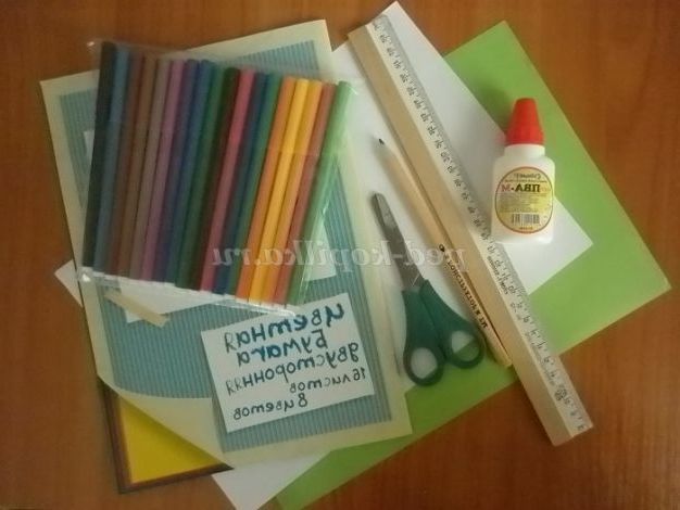Матеріал: кольоровий папір, кольоровий папір для принтера - 1 аркуш зеленого кольору, 1 аркуш білого кольору, клей ПВА, простий олівець, лінійка, ножиці, фломастери.