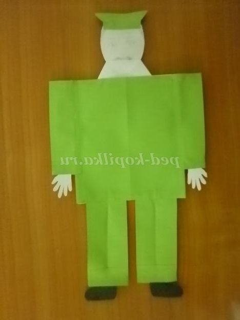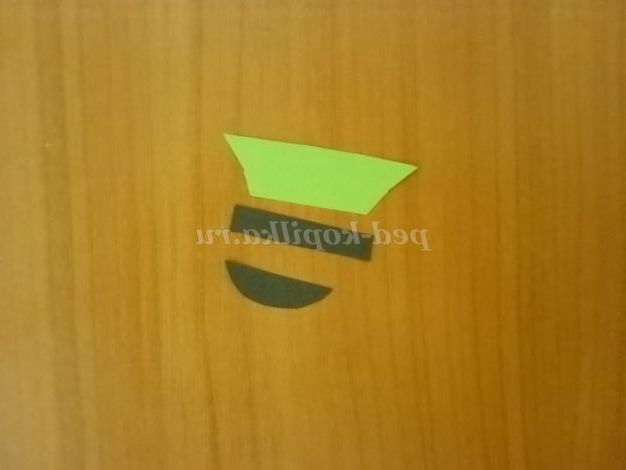 17. 18. З білого паперу вирізаємо овал - голову. А на папері зеленого кольору малюємо солдатський кашкет, спочатку приміряючи її на голову - овал.