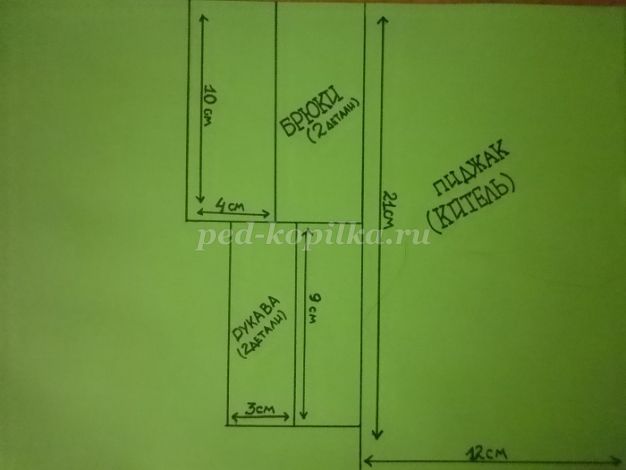 3. Для початку потрібно приготувати заготовки для поробки: штани (2 деталі), піджак і рукава до нього (2 деталі). Розміри деталей вказано на фотографії. Розрізаємо деталі за допомогою ножиць.