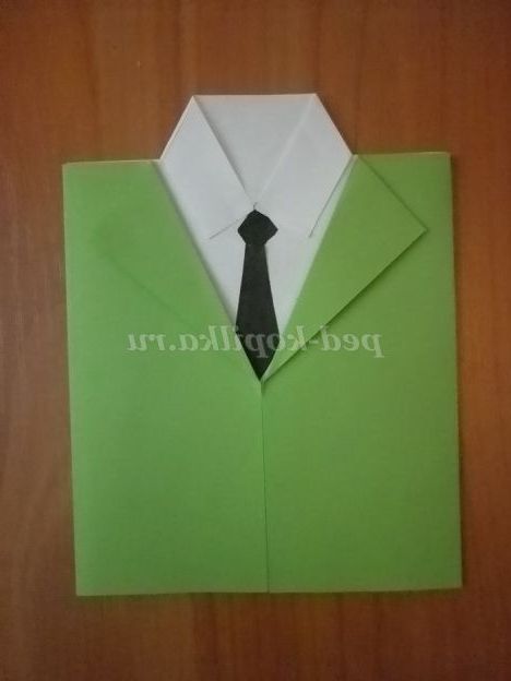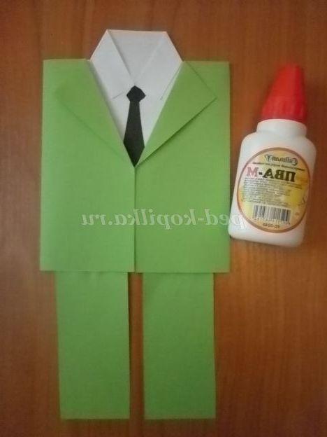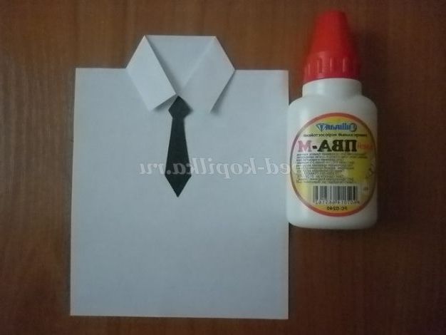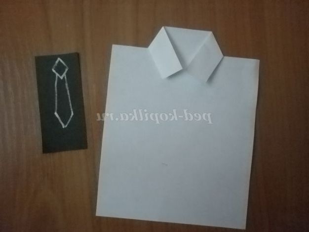12. Одержаний краватку приклеюємо до сорочки. Щоб куточки коміра сорочки не піднімалися, їх також можна підклеїти до сорочки.