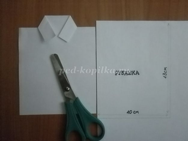 8. Далі приступаємо до виготовлення сорочки. Беремо аркуш білого паперу і за допомогою олівця і лінійки креслимо за запропонованими розмірами контури сорочки. Потім вирізаємо.