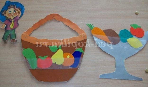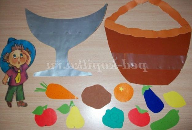 ігрове обладнання: кошик, ваза, контурні зображення овочів і фруктів, виготовлені з кольорового картону; зображення Незнайка;