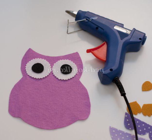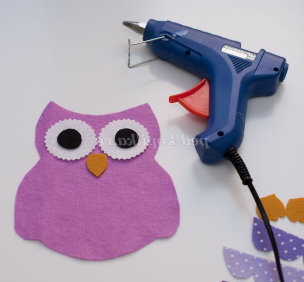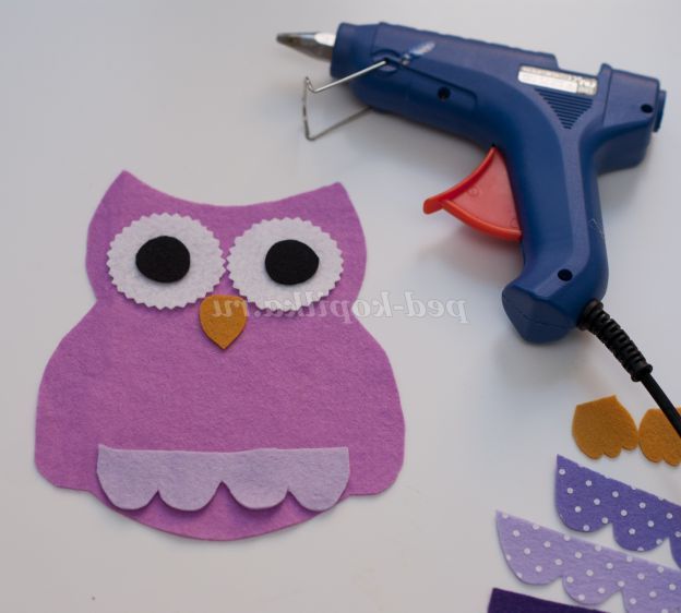 Приклеюємо з допомогою клейового пістолета всі деталі сови, крім крил.