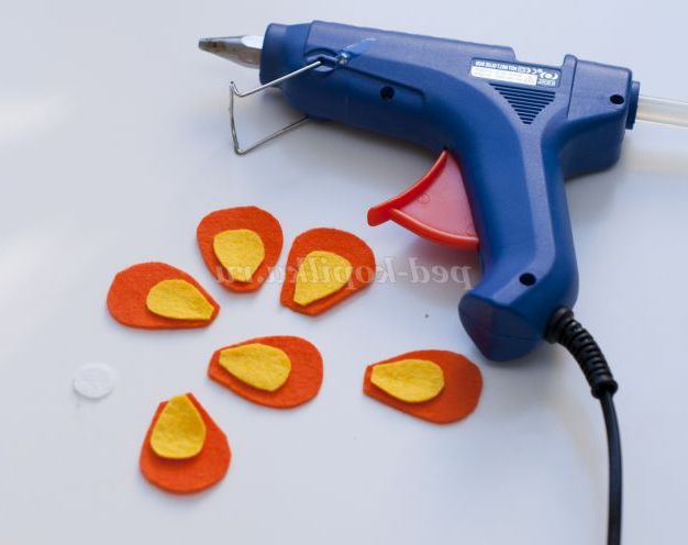 Приклеюємо клейовим пістолетів пелюстки квітів між собою.