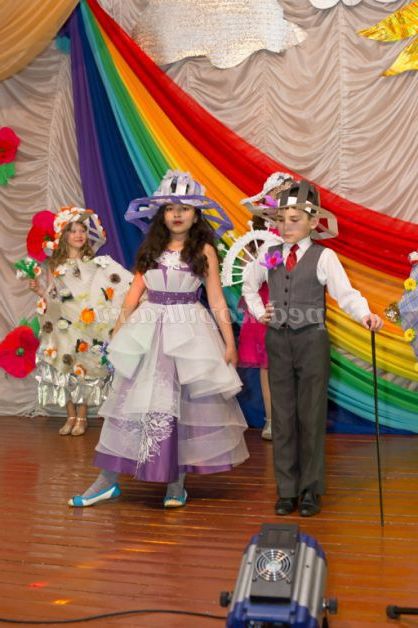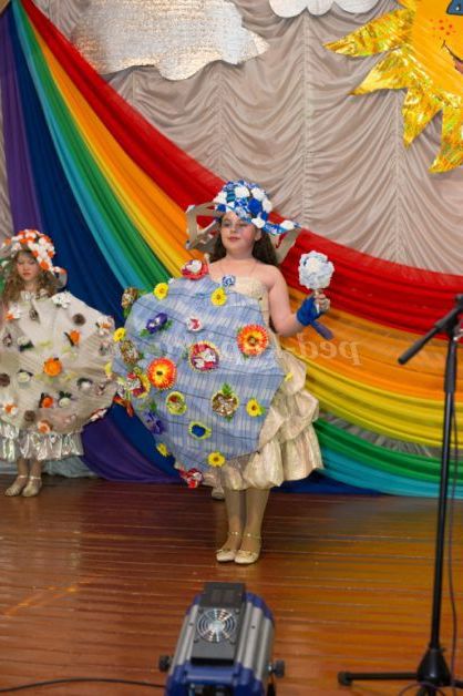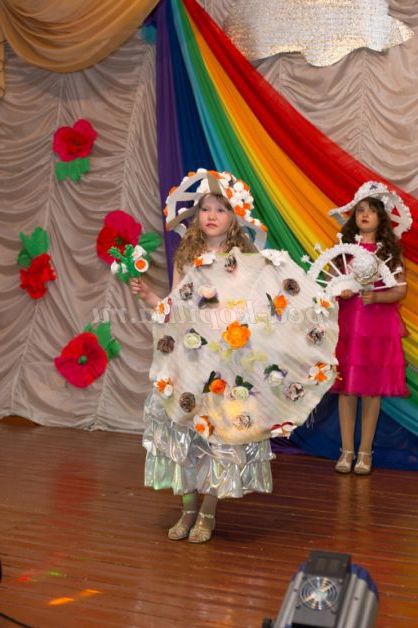 Юна дама демонструє образ романтичного волошки. Капелюшок і букет оформлені квітами з паперових серветок і гофрованого паперу. Парасолька-квітами з фантиків.