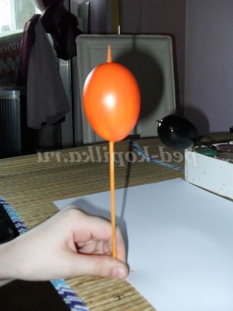 Далі кожне яйця ми фарбують повністю фарбою: перше - чорне, друге - оранжеве, а третє блакитне. Для того щоб не забруднити руки ми надягаємо яйця на тоненьку поличку, я взяла одноразові дерев'яні палички для шашликів.