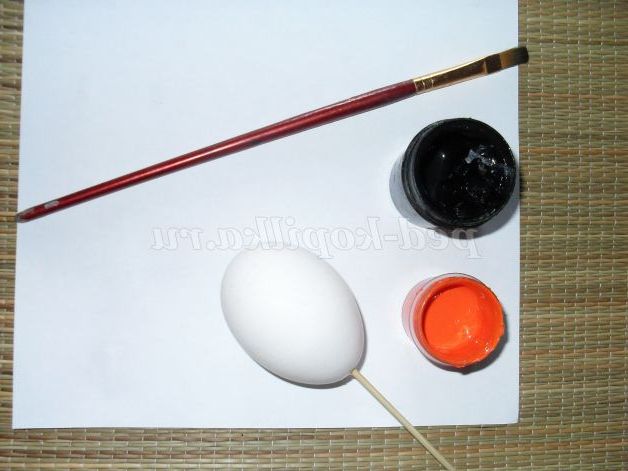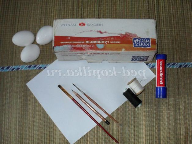 Для виготовлення цієї поробки нам знадобиться: три шкарлупки від курячого яйця (жовток і білок попередньо видаляємо, зробивши два отвори на кінцях яйця, простим видуванням. І незабутній промити шкаралупу під струменем води, інакше можливе появи неприємного запаху. Пензель плоский контур № 8, кисть кругла № 3, гуаш, олівець, папір, ластик, клей, баночка з водою, серветка, нитки(якщо діти захочуть зробити котикам вуса).