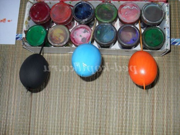 Після того, як всі три яйця повністю пофарбовані ми фіксуємо їх у вертикальному стані для більш кращого висихання і запобігання патьоків. Можна просто поставити палички в стакан або увіткнути в пінопласт. Час висихання приблизно 10 хвилин. Звертаю вашу увагу забарвлення шкаралупи відбувається без участі води, вода нам потрібна тільки для ополіскування кистей.