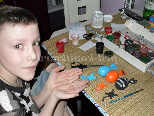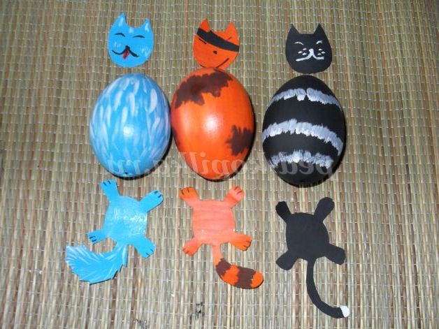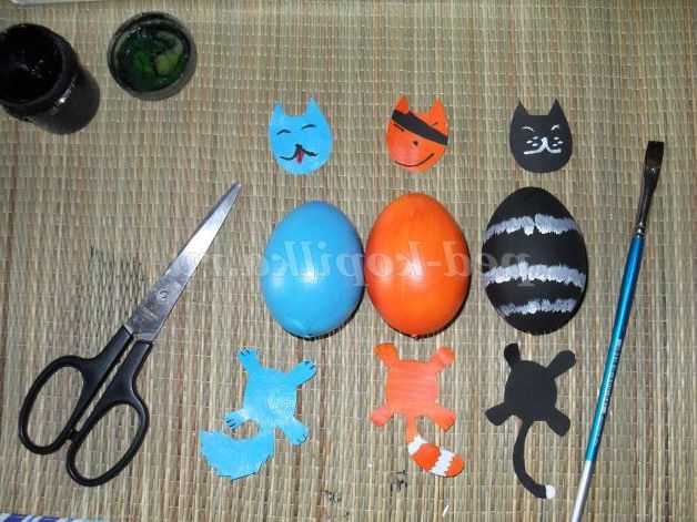 З яєць нескладно виготовити сім'ю веселих котиків: кожен кіт у нас буде зі своїм характером. Один може бути пустуном; інший ласкавим, домашнім котом; третій котик буде фантазійним (наприклад: блакитного кольору, який не характерний в природі для цих тварин).