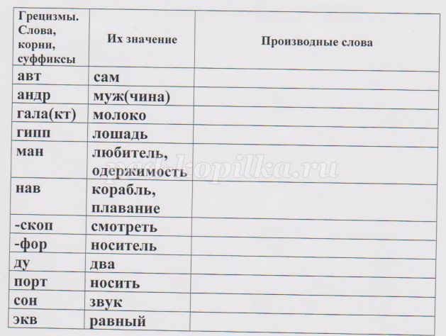 Використовуючи лексичні елементи еллінів і римлян, що збереглися в російській мові, учням належить сконструювати відомі їм назви предметів і явищ пізнається нами світу. Також учні повинні пояснити сенс запозичених слів.