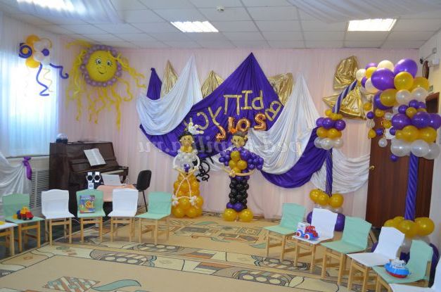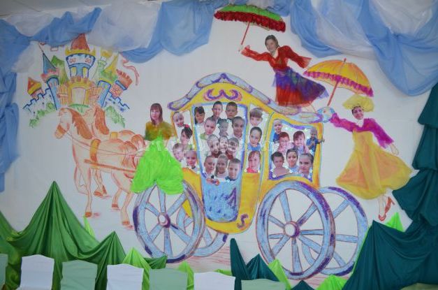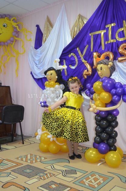 Ось хочу вам розповісти, як ми прикрасили музичний зал на випускний бал у дитячому садку. Сфотографували всіх дітей крупним планом вирізали фотографії для оформлення однієї стіни. Спочатку приклеїли на стіну шпалери білого кольору і намалювали на шпалерах: карету, замок, вихователів і помічника вихователя. Малювали ми восковими та гелієвими мелками.Для блиску додали блиск для волосся і пайетки. Далі приклеїли фотографії выпускников.Платья вихователів про помічника прикрасили тканью.Из зеленої тканини зробили ялинку, прикрасили небо білою про блакитною тканиною. Стеля обтягнули тканинами і прикрасили кульками. Інші стіни ми прикрасили кульками і тканинами. На синю тканину завдали назва свята"До побачення дитячий садок". Трон царя теж прикрасили золотою тканью.Арку теж прикрасили тканиною і поставили біля входу в зал. З повітряних куль зробили дівчинку і хлопчика.