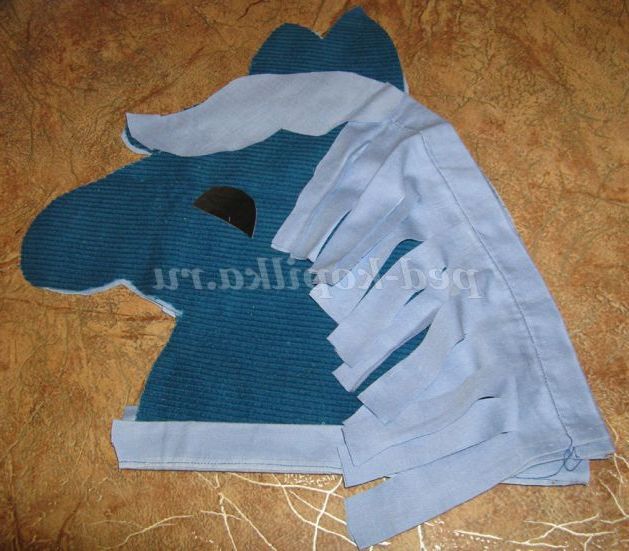 Окремо на картоні обвела чубчик і по ній вирізала дві деталі з блакитної тканини. З неї ж, відрізавши смугу розміром 30 на 15 см, зробила гриву. Один край тканини було оброблено, а другий я надрізала бахромою.