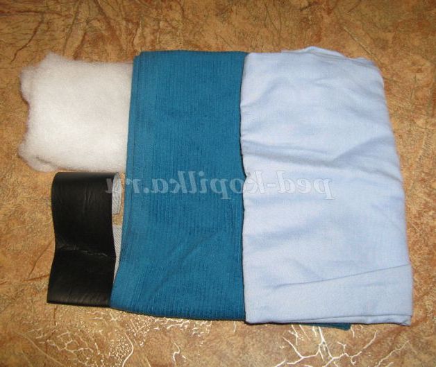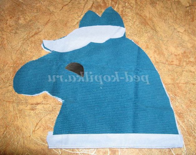 Вибрала наступні матеріали для виготовлення об'ємної шапочки. : вельвет відповідного кольору розміром 50 на 100 см (2014 - рік Синього коня), блакитна тонка тканина для підкладки, трохи синтепону, шматочок темної шкіри для очей.