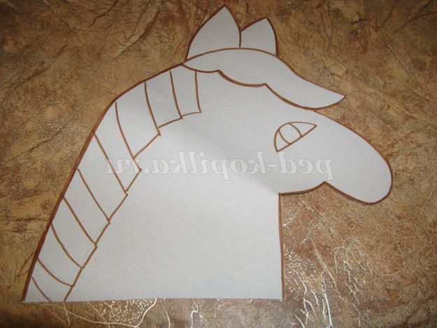 Для новорічної вистави знадобилася нам конячка - символ наступаючого 2014 року. Вирішили, що це має бути дитина у відповідній масці або шапочці. Сама я малювати кінську мордочку не вмію, тому знайшла в книзі з казками чудовий кінський профіль. Збільшивши зображення по клітинам, зробила з картону заготовку.