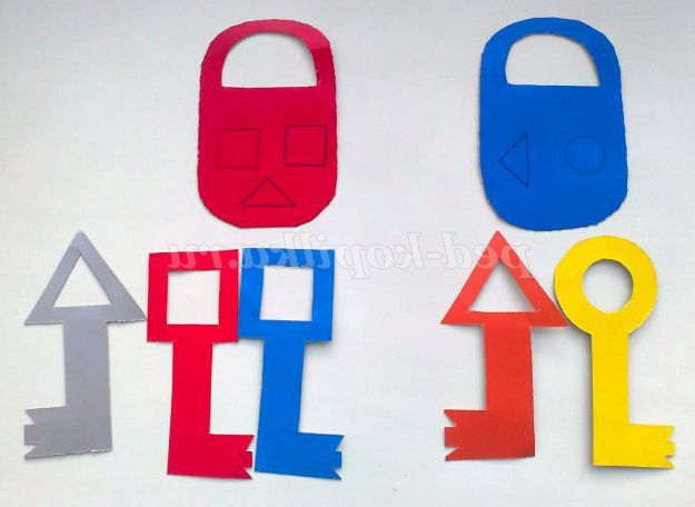 Вихователь показує аркуш із зображенням воріт: Які незвичайні ворота, давайте розглянемо, з яких фігур вони побудовані. На воротах замки, ми повинні відкрити їх. Потрібно підібрати ключі, щоб форма кільця збігалася з фігурою на замку.