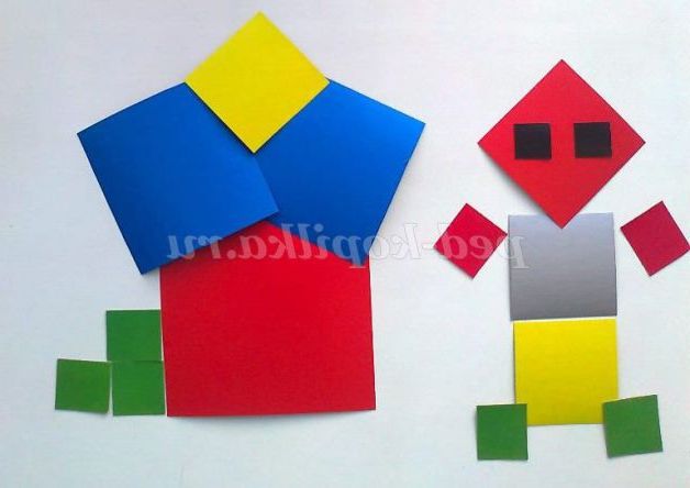 (Діти розглядають зображення, складене з квадратів. Робиться висновок, що ми потрапили в квадратний місто). Так, це незвичайне місто, тут все квадратне. А як звуть нашого нового знайомого? (Діти придумують ім'я «Робот Квадратик»). Пропоную всім надіти чарівні окуляри і подивитися навколо. Якої форми те, що ви бачите? (Діти з наборів фігур викладають зображення чоловічків, рослин, тварин використовуючи тільки квадрати. Роботи розглядаються, кожен розповідає, що вийшло).