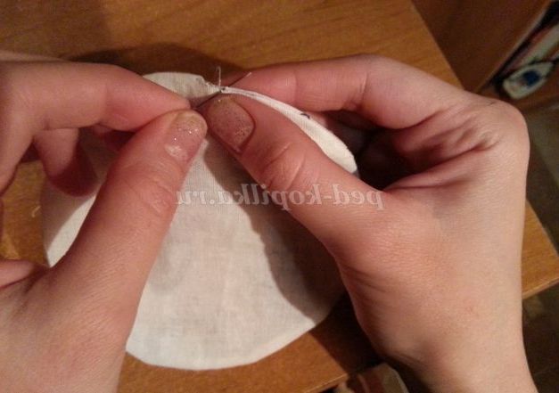 8. Вирізаємо голову з картону, а з білої тканини вирізаємо деталь з припусками 1,5 див. Обтягуємо картон тканиною, закріплюючи клеєм ПВА. Зверніть увагу, що картон повинен бути білим з лицьового боку, т. к. тканина може просвічувати.
