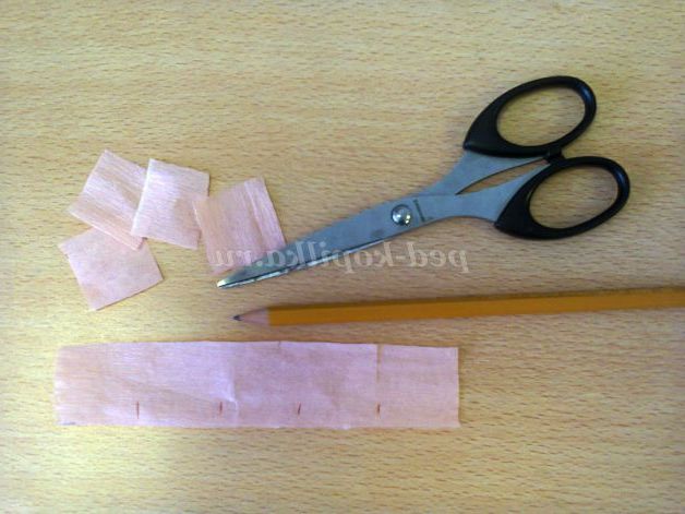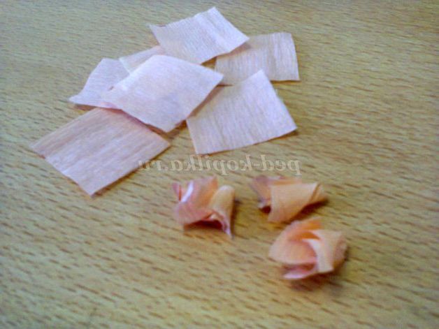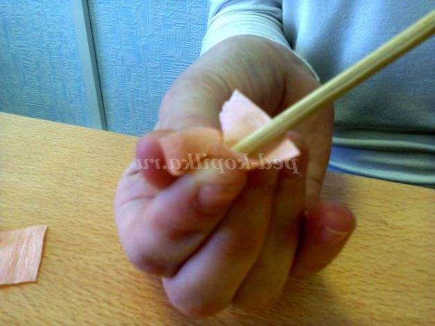 2. Обклеювати пінопластовий кулька будемо в техніці торцювання папери - квадрат з гофрованого паперу закручуємо з допомогою олівця. Робити це потрібно не кваплячись, щоб не порвати папір.