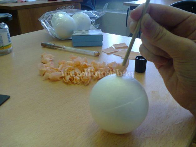 4. Щоб приклеїти елемент до кульки, одягаємо його на олівець і мажемо знизу клеєм. Приєднуємо до кульки і тримаємо кілька секунд. Наступний «стаканчик» приклеюємо впритул до першого. Необхідно стежити за тим, щоб не було проміжків між елементами.