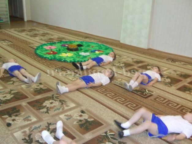 Вихователь: Ми добре попрацювали, і я сподіваюся, що дереву ми допомогли, а тепер пора йти далі. Дивіться, перед нами глибока яма з берегом вузьким. Пройти по ньому просто складно, значить підемо боковим приставним кроком. Будьте обережні, не штовхайте один одного, а при необхідності не забувайте допомагати товаришеві.