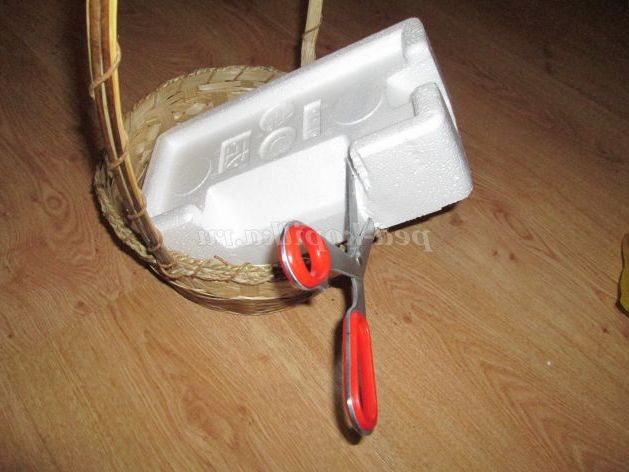 Шматок пінопласту ножицями ріжемо по формі дна карзинки і поміщаємо його туди