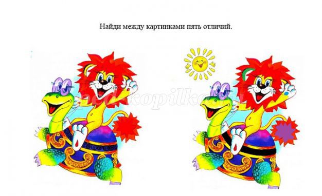 Дітям пропонується можливість вгадати, хто це і з якого мультфільму цей персонаж. Потім дорослий пропонує описати її, і розглянути другу частину ілюстрації. При розгляданні другий частини ілюстрації треба знайти відмінності і визначити, чим вони відрізняються і якого кольору відмінності.