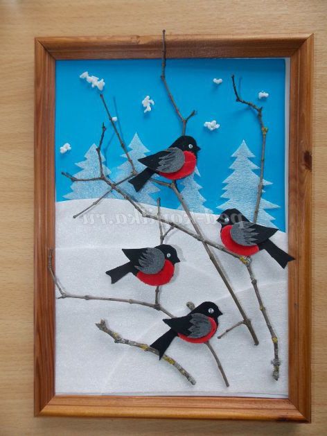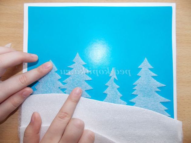 З пінополіетилену, який залишається від упаковки різних товарів вирізаємо засніжені пагорби довільної форми (залежно від розмірів наявних шматків). Його можна замінити синтепоном або ватою. Приклеюємо пагорби на основі. Починаємо приклеювати від горизонту, тобто від середини аркуша до низу картини. Головне - не допускати просвітів фону.