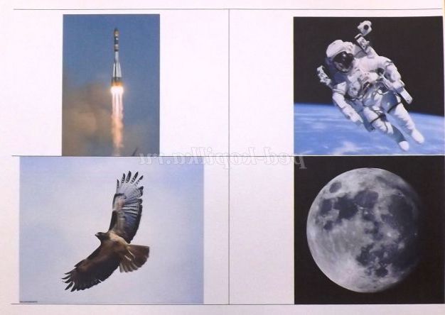 Матеріали: 2 комплекти карток з різними зображеннями ракет для ігр: «Знайди пару» і «Опиши ракету», картки для гри «Четвертий зайвий», зірочки з картону, обклеєні блискучим папером.