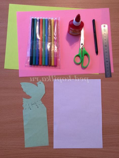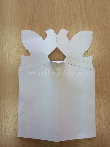 На альбомний аркуш, вже зігнутий навпіл кладемо шаблон і простим олівцем обводимо контури голуба, трикутник, пунктирні лінії.