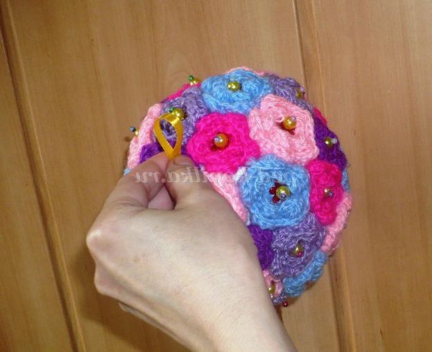 Декоруємо крону. Це самий приємний і цікавий момент. Ми будемо прикрашати крону в'язаними трояндами різних кольорів. В'яжемо трояндочки за схемою.