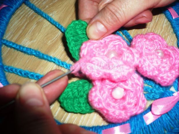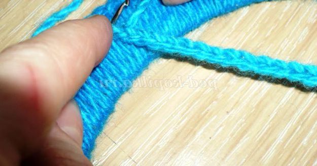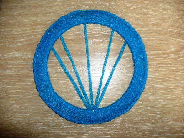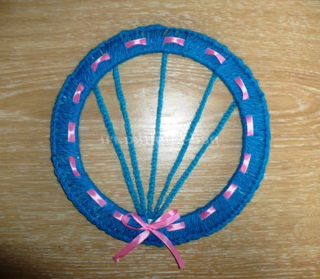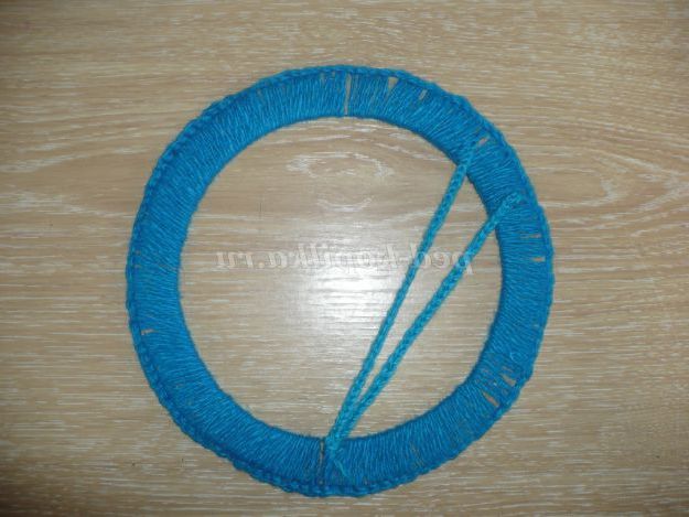З задньої сторони внизу рамки гачком причепити нитка блакитного кольору і зв'язати ланцюжок з повітряних петель, потім причепити її вгорі рамки з заднього боку