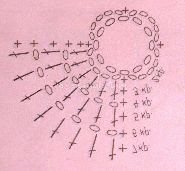 Так пров'язуємо 5 ланцюжків, розташовуючи їх на однаковій відстані один від одного. Всі ланцюжки в'яжемо з однієї петлі