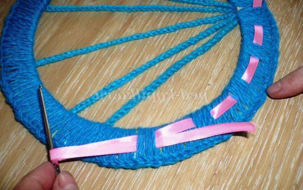Прикрашаємо панно атласною стрічкою. Вставляємо рожеву стрічку по довжині окружності, кінці стрічки зав'язуємо бантиком
