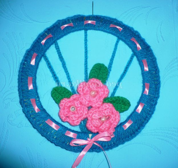 Для роботи знадобиться: щільний картон,пряжа блакитного,рожевого,зеленого кольорів,циркуль, ножиці,голка для пришивання,намистинки,простий олівець,гачок і атласні стрічки рожевого та зеленого кольорів
