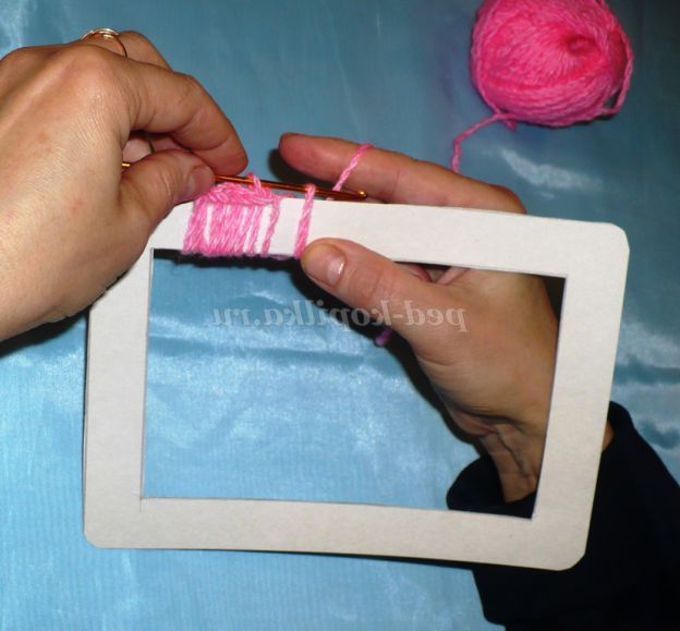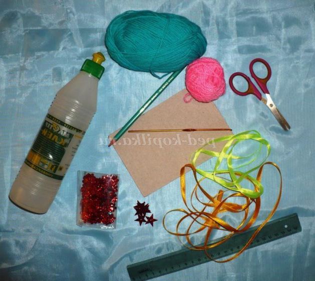 Для роботи знадобиться: картон за розміром фотографії або картини, гачок, ножиці, олівець, пряжа рожевого і блакитного кольорів, паєтки, бісер, клей, атласні стрічки завширшки 0,5 див.