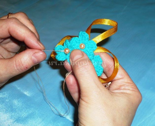 Прикрашаємо букетик незабудок атласною стрічкою. Для цього з задньої сторони букетика формуємо три листки з стрічки.