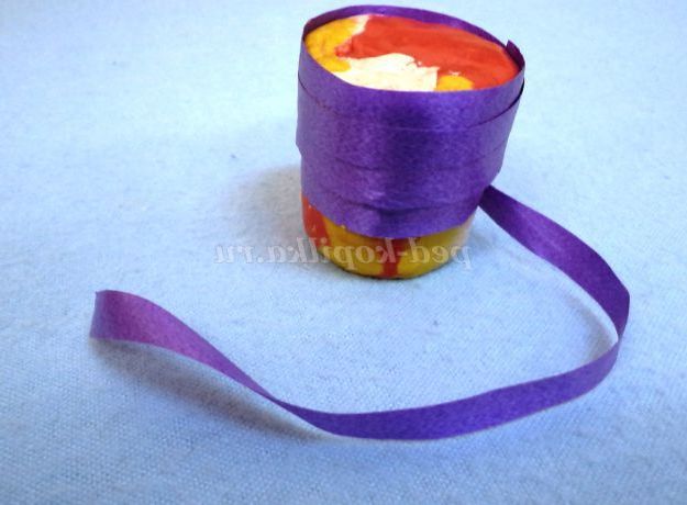 8.Не знімаючи трубочки з інструменту, встромляємо її в пластилін горизонтально, починаючи з самого низу. Виконуємо торцювання рядами знизу вгору.