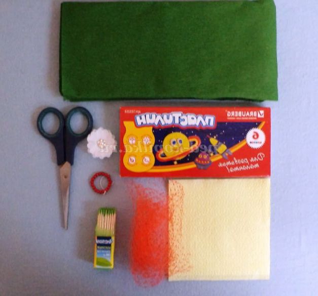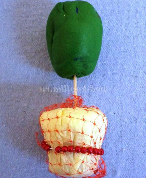 1.Необходимый матеріал: пластилін, крепований зелена папір, ножиці, серветка, зубочистки, прикраси (намистини, сітка, квітка)