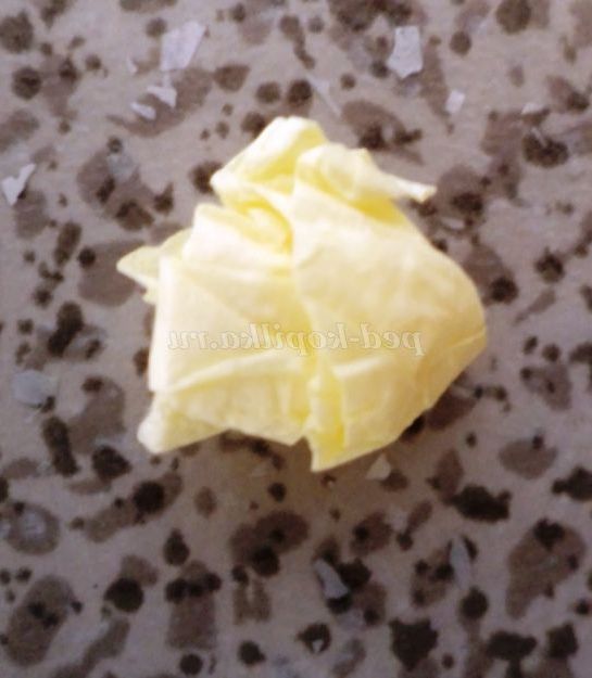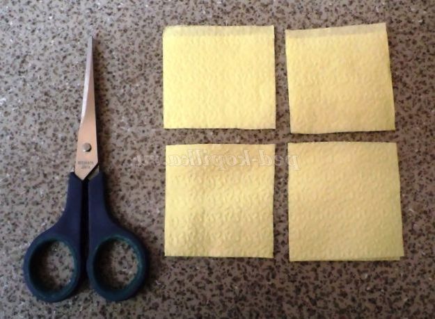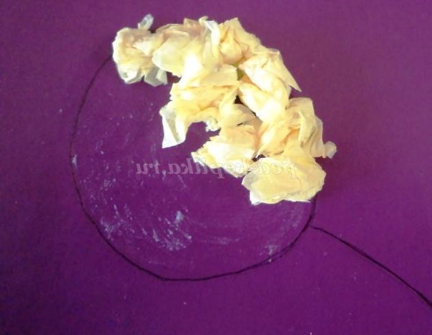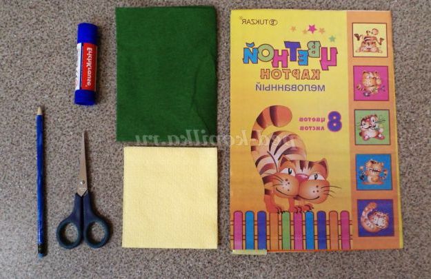 Необхідний матеріал: кольоровий картон, серветки жовтого кольору, крепований зелена папір, ножиці, клей, простий олівець.