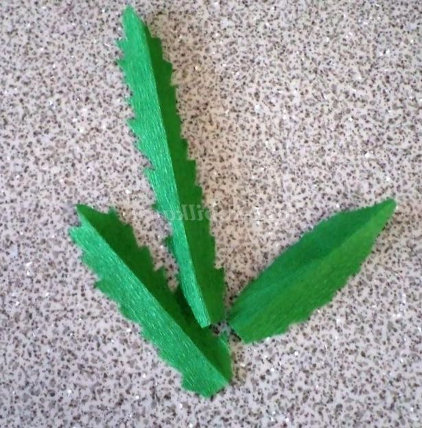 9. Вирізаємо з крепованого зеленої смужки паперу (стебла) і листя (2 - 3)
