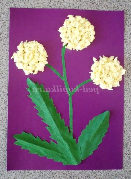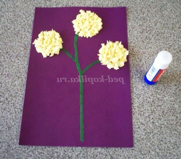Аплікація. Кульбабки з паперових грудочок і крепованого паперу