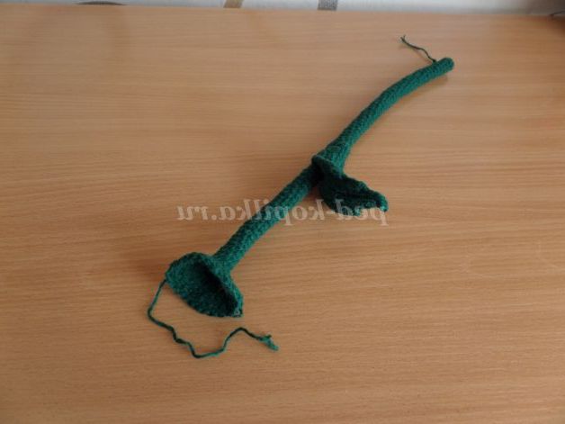 8. Провязав всю трубочку, на кінці її в'яжемо розширення під ковпачок-воронку і прив'язуємо листочок до стеблинки