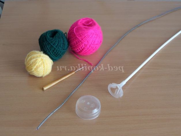 Вам знадобитися: кольорова шерсть, гачок, дріт, великі кришки від пляшок 7шт., пластикова трубочка і ковпачок від кульки.