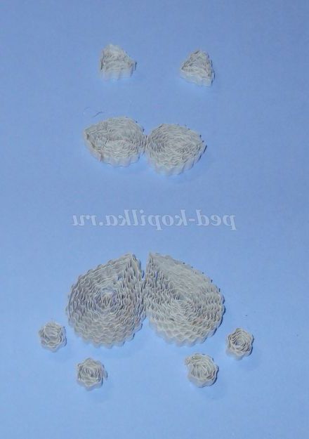 Одну смужку ділимо навпіл. З половинки скручуємо диск - борідку для мордочки. Залишилася половинку розрізаємо ще раз навпіл і скручуємо ще два «пальчика».
