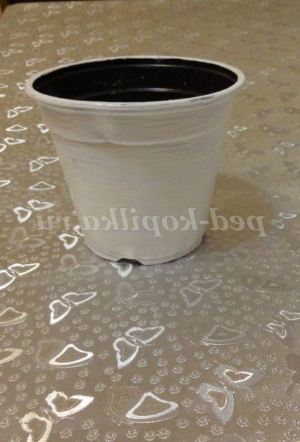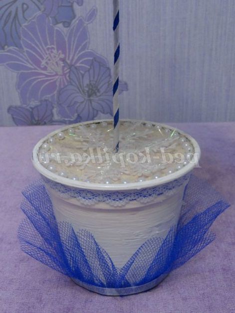 По краю горщика викладаємо намистинками і в серединку кладемо декоративну сніжинку.