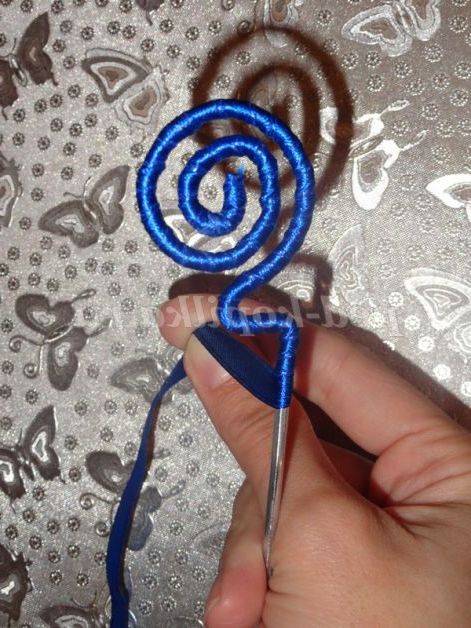 Обмотуємо синьою тасьмою дріт, починаємо зверху, з спіральки. Через кожні 5-6 см наносимо клей. На кінці тасьми теж промазуємо клеєм, щоб тасьма не размоталась.