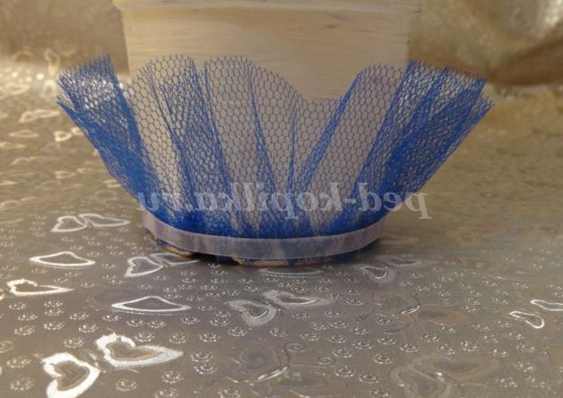 Робимо з фатину спідничку і стягаємо нитку біля основи горщика. Через кожні 3 сантиметри наносимо клей.