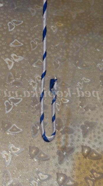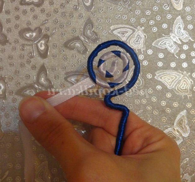 Потім поверх синьої тасьми обмотуємо білою тасьмою. Кожні кілька сантиметрів капаємо клей. Починаємо так само зверху, закріпивши кінці тасьми клеєм.