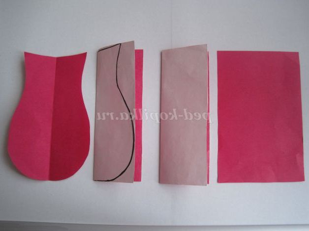 Роботу починаємо з виготовлення вази. Для цього беремо аркуш паперу малинового кольору і складаємо його навпіл, малюємо половинку вази і вирізаємо.